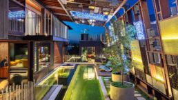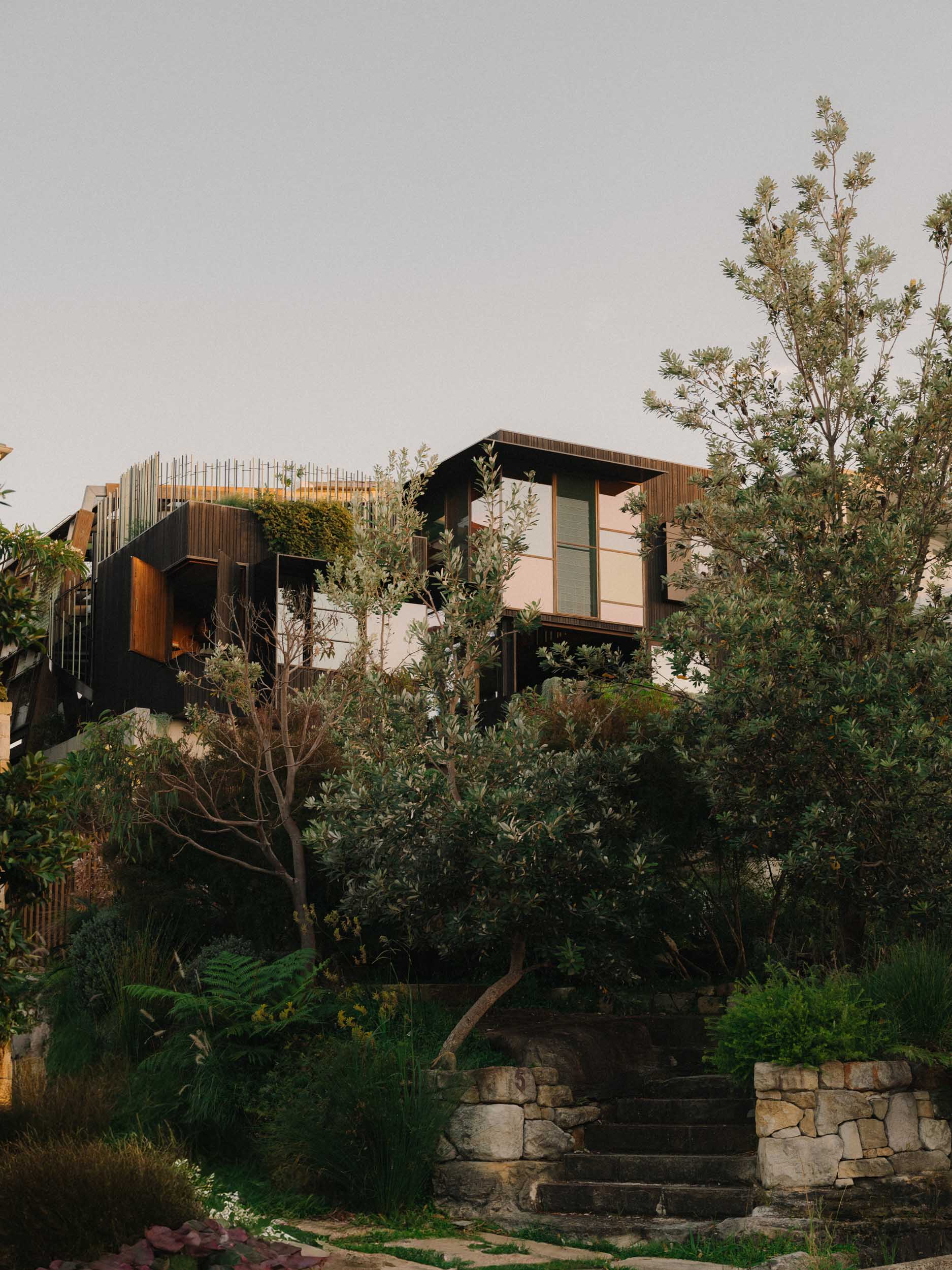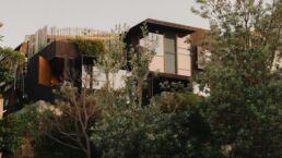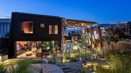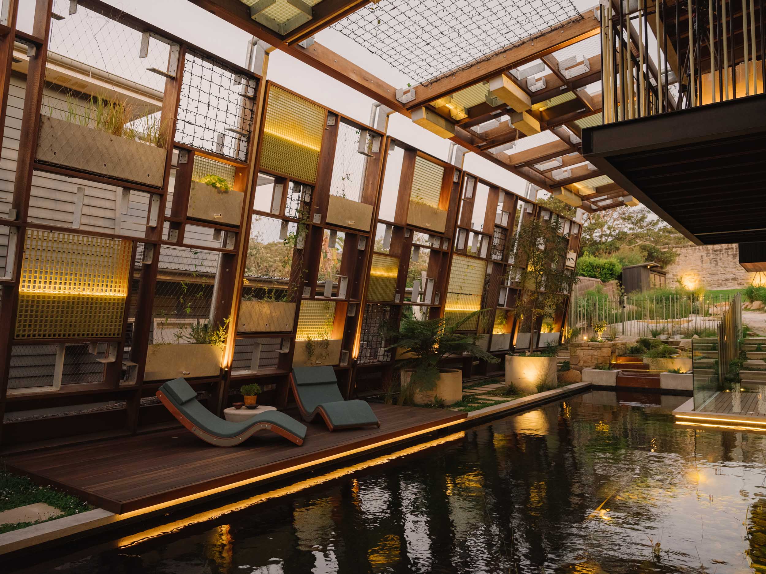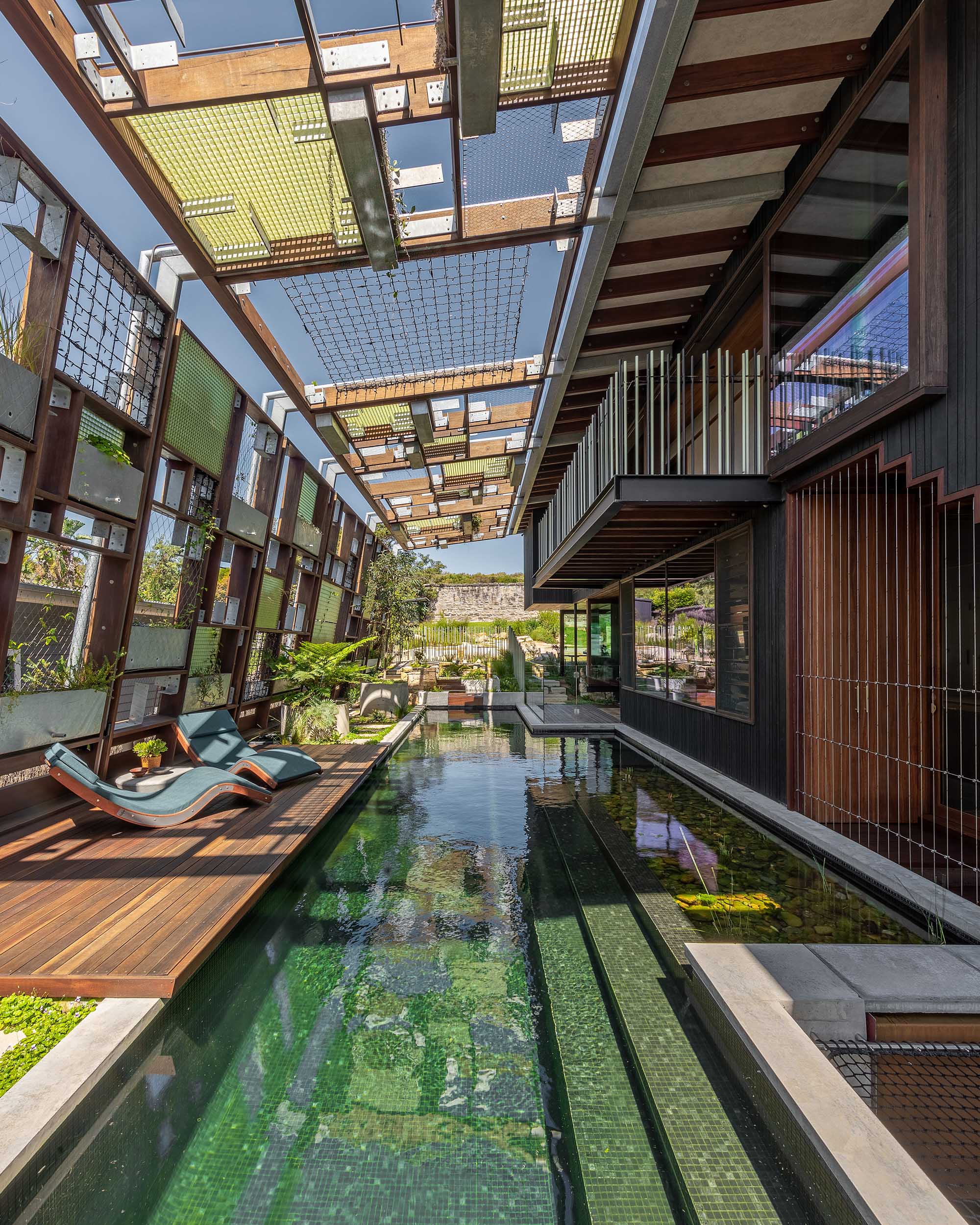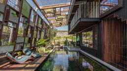 The natural pool, flowing like a creek through the living spaces, is surrounded by lush plant life growing in a canopy overhead, creating a rainforest-like atmosphere. This tranquil water source connects all the rooms, inviting a constant interaction with nature. The house is designed to embrace its surroundings, with water cascading from the rear and a creek running through the home, making the landscape an integral part of the living experience. The pool and landscape was a collaboration between CplusC Architects and Builders, Duncan Gibbs LArch, and the Land Forms Team.